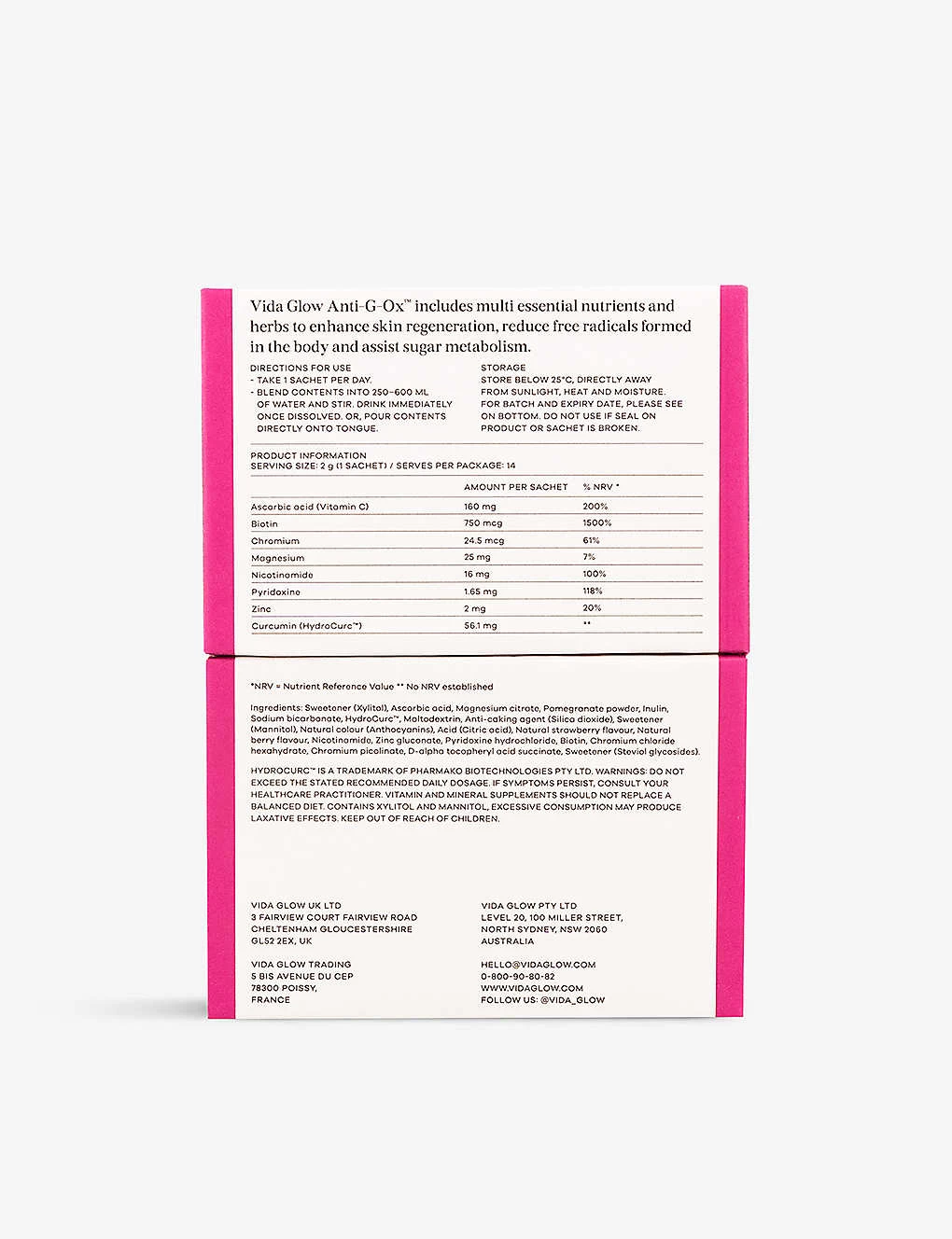 Ascorbic Acid, natural strawberry flavour, dl-alpha-tocopheryl succinate, chromium picolinate, chromium chloride hexahydrate, pyridoxine hydrochloride, biotin, nicotinamide, zinc gluconate, natural berry flavour, natural colour (Anthoyanins), Bicarbonate of Soda, sweetener (mannitol), Anti-caking agent (silicon dioxide), Maltodextrin, HydroCurc TM, inulin, pomegranate powder, magnesium citrate, Sweetner (Xylitol), Acidity Regulator: Citric Acid, Sweetener (steviol glycosides),