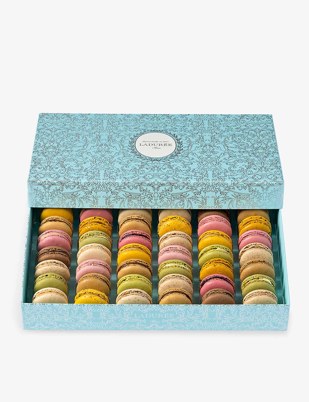 Caramel (sugar, almond, egg white, butter (milk), cream (milk), water, glucose syrup, starch, egg white powder, salt flower)(Almonds,Egg,Milk), Chocolate (sugar, almond, cream (milk), egg white, dark chocolate (cocoa beans, sugar, cocoa butter, emulsifier: soya lecithin (E322), vanilla) (11%), cocoa, water, starch, egg white powder(Almonds,Egg,Milk,Soya), Pistachio (sugar, almond, egg, pistachio (10%), butter (milk), water, sucrose syrup, starch, turmeric concentrate, maltodextrin, egg white powder, spirulina, apple, aroma, acidity regulator: citric acid (E330))(Almonds,Egg,Milk,Pistachio), Raspberry (sugar, almond, egg white, raspberry, morello cherry, water, glucose syrup, starch, lime, egg white powder, gelling agent: pectin (E440i), colours: carmine (E120), β-carotene (E160a(iii)), preservative: potassium sorbate (E202), aroma: raspberry, stabiliser: xanthan gum (E415))(Almonds,Egg), Rose (sugar, almond , egg white, cream (milk), white chocolate (sugar, cocoa butter, whole milk powder, emulsifier: Soya lecithin (E322), vanilla extract), butter (milk) , water, starch, egg white powder, maltodextrin, rose essential oil (0,01%), colour: carmine (E120), preservative: potassium sorbate (E202))(Almonds,Egg,Milk), Vanilla (sugar, almond, egg white, cream (milk), butter, white chocolate (sugar, cocoa butter, whole milk powder, emulsifier: soya lecithin (E322), vanilla extract), water, egg white powder, vanilla, cornstarch, glycerin)(Almond,Egg,Milk,Soya),