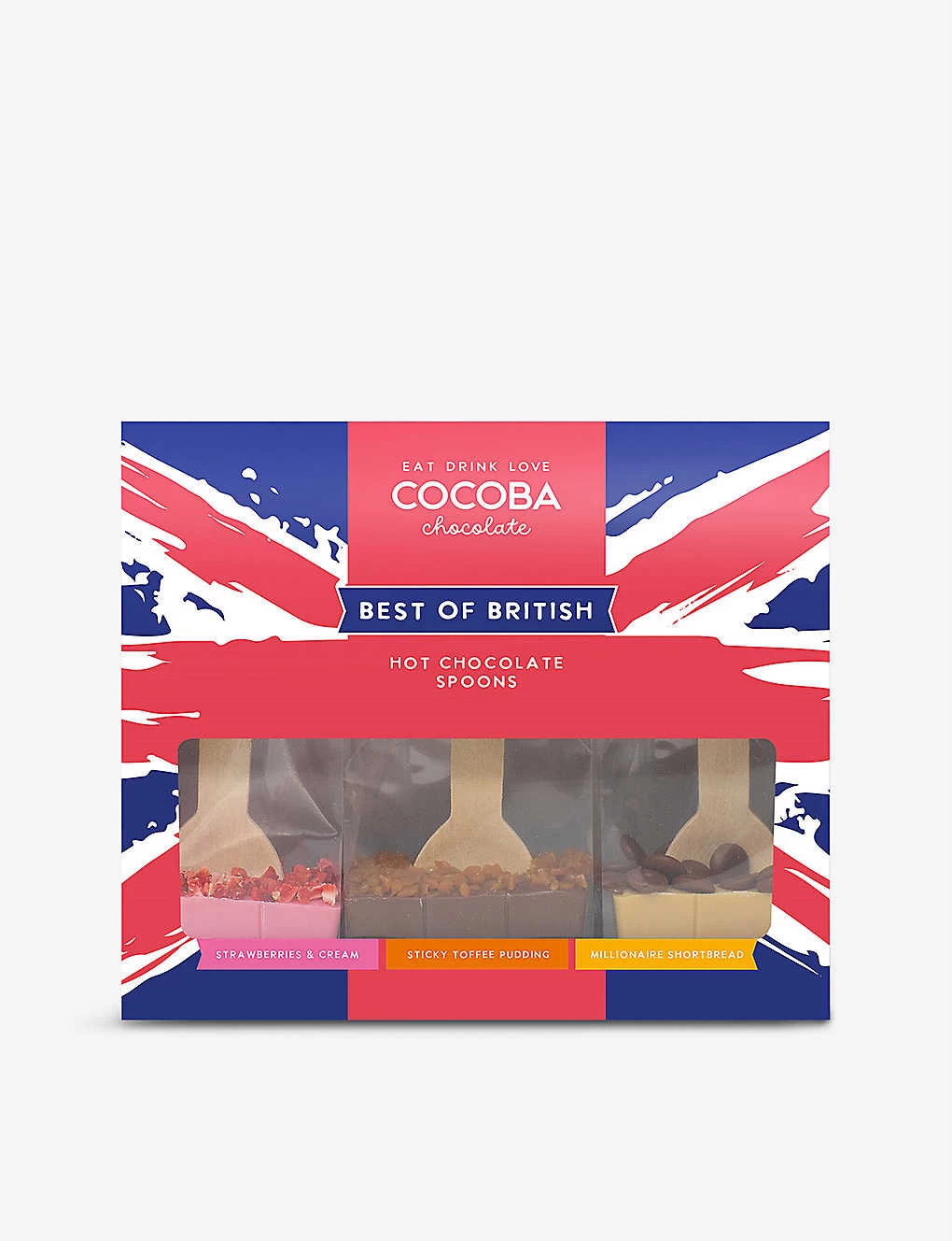 Milk Chocolate and Caramel Flavour Spoon (33%) (Sugar, Cocoa Butter, Whole Milk Powder, Cocoa Mass, Lactose (Milk), Whey Powder (Milk), Emulsifier: Soya Lecithin; Flavourings), White Chocolate and Strawberry Flavour Spoon (33%) (Sugar, Cocoa Butter, Whole Milk Powder, Lactose (Milk), Whey Powder (Milk), Milk Fat, Flavourings, Emulsifier: Soya Lecithin; Colour: Carmine), Caramel Flavour White Chocolate Spoon (30%) (White Chocolate (Sugar, Cocoa Butter, Whole Milk Powder, Lactose (Milk), Whey Powder (Milk), Milk Fat, Flavouring, Emulsifier: Soya Lecithin) Colour; Caramel, Flavourings), Milk chocolate Chips (Sugar, Cocoa Butter, Whole Milk Powder, Cocoa Mass, Lactose (Milk), Whey Powder (Milk), Emulsifier: Soya Lecithin; Flavouring), Caramel Pieces (Glucose Syrup, Sugar, Sweetened Condensed Milk (Milk, Sugar), Butter (Milk, Salt), Salt), Freeze Dried Strawberry Pieces.