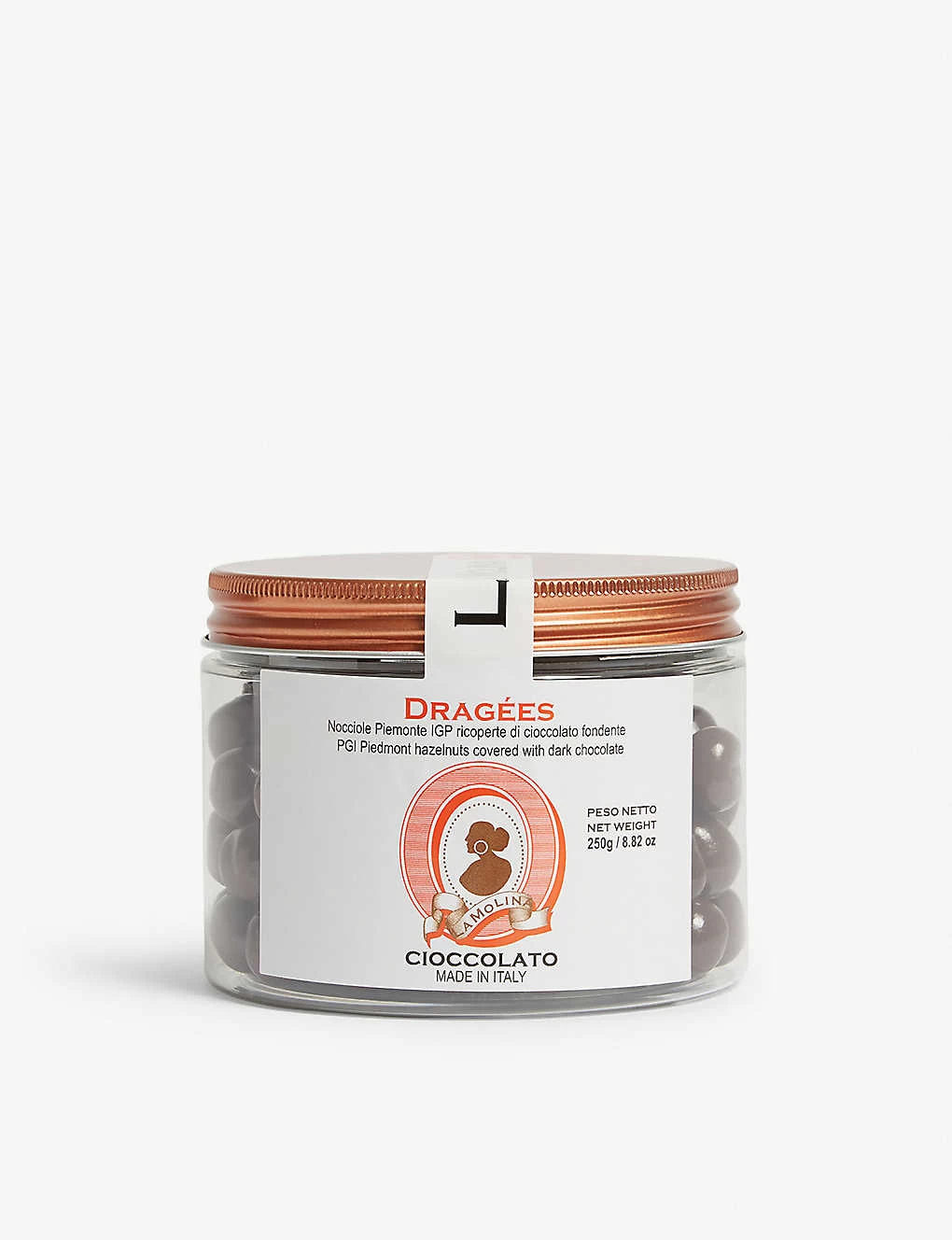 PGI Piedmont hazelnuts 47%, cocoa mass, sugar, cocoa butter; Emulsifier: soy lecithin GMO free; natural flavour: vanilla; glazing agent: shellac, Arabic gum.Contains: hazelnuts and soy. Manufactured in a facility that processes also tree nuts, peanuts, sesame, cereals with gluten, eggs and coconut. May contain traces of various nuts, peanuts, sesame, cereals with gluten and egg