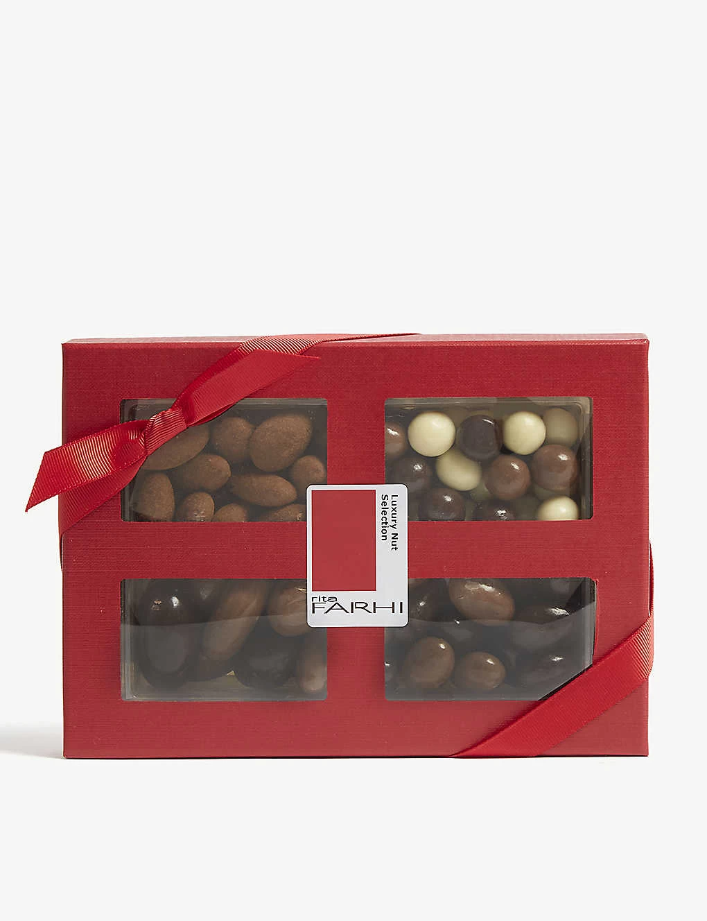 (Brazils nuts (25%), Almonds (25%), Hazelnuts (25%) & Cinnamon Dusted Almond (25%)), Sugar, Cocoa Butter, Cocoa Mass, Milk Powder, Whey Powder (from Milk), Vegetable Fat (palm), Emulsifier: Sunflower Lecithin, Glazing Agents: Gum Arabic, Shellac. Dark Chocolate contains vegetable fats in addition to Cocoa Butter (Cocoa Solids 35% min). Milk Chocolate contains vegetable fat in addition to Cocoa Butter (Milk Solids 20% min, Cocoa Solids 20% min). White chocolate contains vegetable fat in addition to Cocoa Butter (Milk solids 14% min).