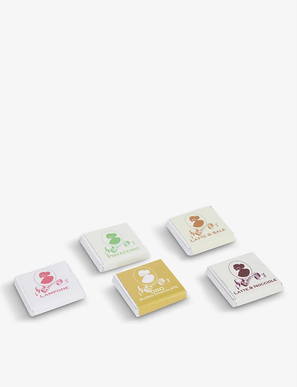 Contains: Assorted napolitaines: white and raspberry chocolate squares, blond chocolate squares, milk chocolate squares 40% cocoa min. with grained hazelnuts, milk chocolate squares 40% cocoa min. with salt, pistachio squares.