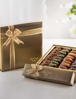 Dates, caramelised pecan(Nuts), sugar, roasted almonds(Nut), gum arabic E414, acacia honey, pistachio strips(Nut), sugar, ginger peel, candied ginger, sugar, Glucose Syrup, Pecans(Nuts), Orange Peel, Orange Peel, Glucose Syrup, Lemon Peel, Lemon Peel, Glucose Syrup, Pistachios(Nuts), Glucose Syrup, Cocoa Butter, sugar,
