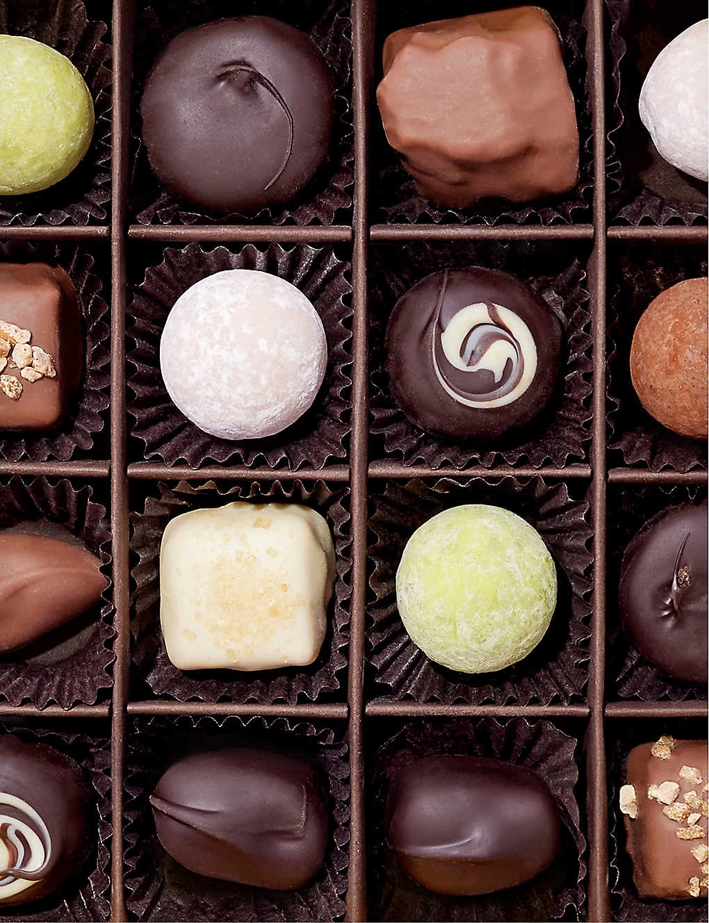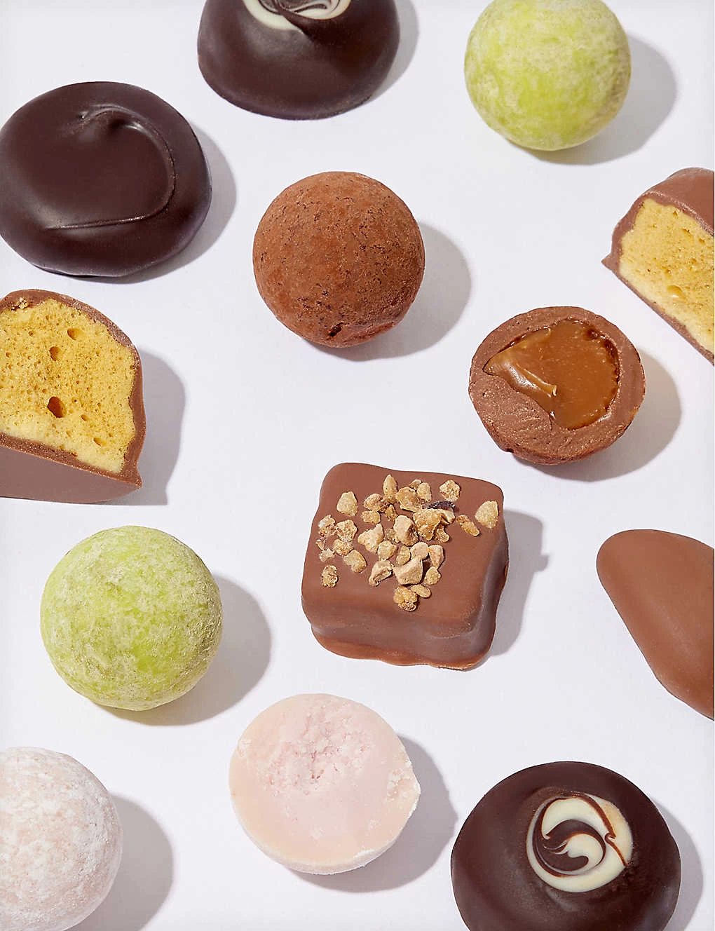 White Chocolate (Sugar, Cocoa Butter, Whole Milk Powder, Emulsifier: Soya Lecithin; Natural Vanilla Flavouring)(Milk,Soya), Milk Chocolate (Sugar, cocoa butter, whole milk powder, cocoa mass, emulsifier (soya lecithin), natural vanilla flavouring)(Milk,Soya), Cane Sugar, Dark Chocolate (Cocoa mass, sugar, cocoa butter, emulsifier (soya lecithin).(Soya), Glucose Syrup, Ginger, Brazil Nuts(Nuts), Golden Syrup, vegetable fat (sunflower, olive, rapeseed, coconut)(Nuts), Water, Hazelnut(Nuts), Pecans(Nuts), Pistachios(Nuts), Sweetened condensed skimmed milk(Milk), Cocoa Powder, Skimmed milk powder(Milk), Icing Sugar, Whole Milk Powder(Milk), Sea Salt, Cocoa Butter, Sodium Bicarbonate, Natural flavourings, Maize Starch, Freeze dried coffee, Colours: Beetroot red, curcumin, Emulsifiers: Soya lecithin, mono and diglycerides of fatty acids, lecithin(Soya), Strawberries, Cocoa Mass, Vanilla seeds, Invertase,