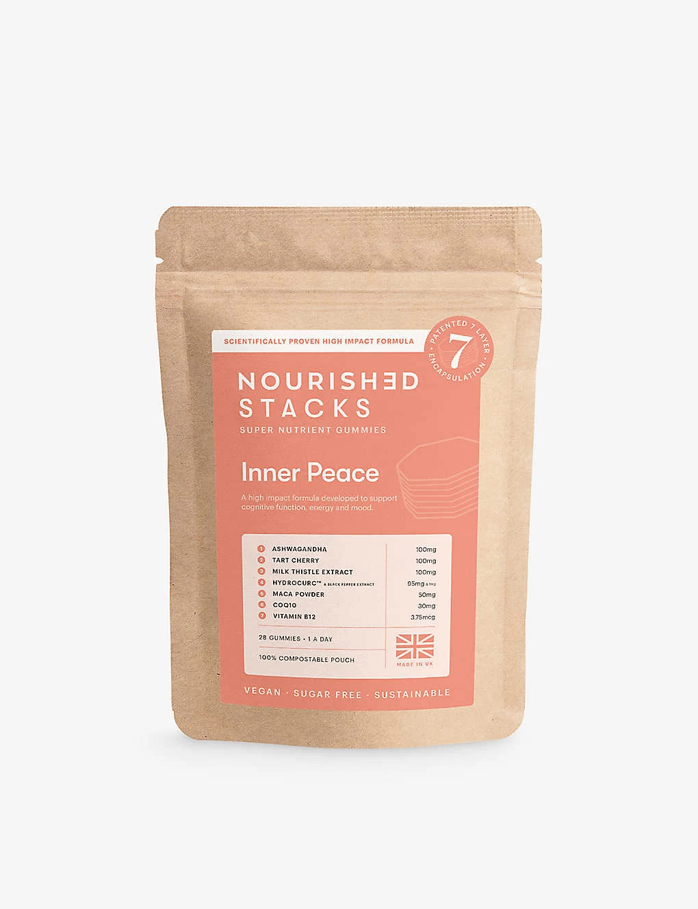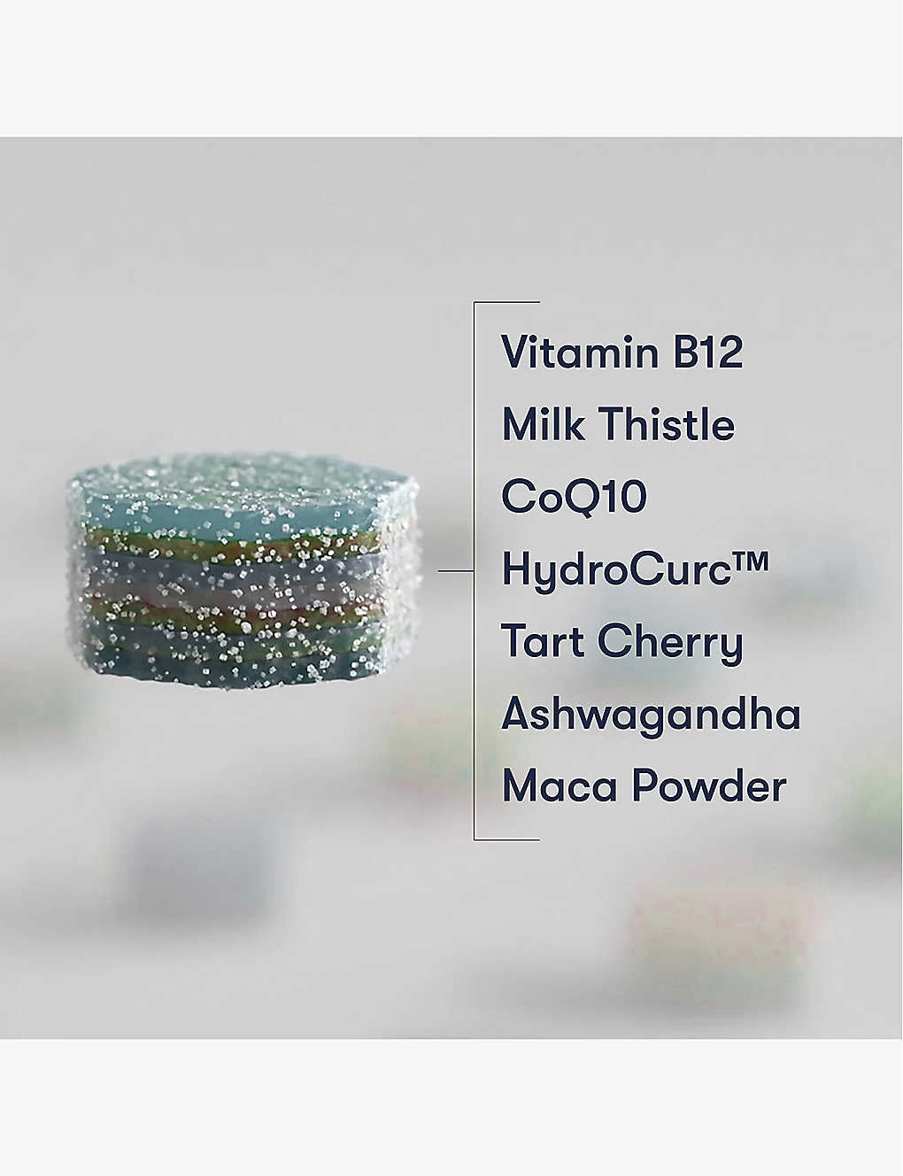 Ingredients: Maltitol Syrup, Erythritol, Pectin, Potassium Citrate, Citric Acid, Maltodextrin, Malic Acid, Tart Cherry, Ashwagandha, Maca Powder, Milk Thistle Extract, HydroCurc, CoQ10, Vitamin B12, Black Pepper Extract, Natural Colours & Natural Flavours from Plants & Fruits. , Nourishment , Amount , NRV , Vitamin B12 , 12mg , 85% , Milk Thistle Extract , 100mg , N/A , HyrdroCurcâ„¢? & Black Pepper Extract , 95mg + 1mg , N/A , Tart Cherry , 100mg , N/A , Ashwagandha , 100mg , N/A , Maca Powder , 50mg , N/A , CoQ10 , 30mg , 100%