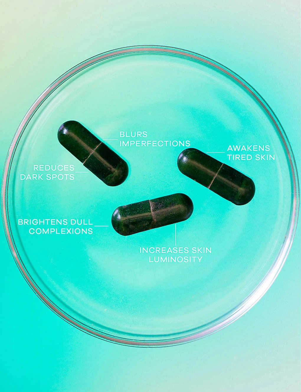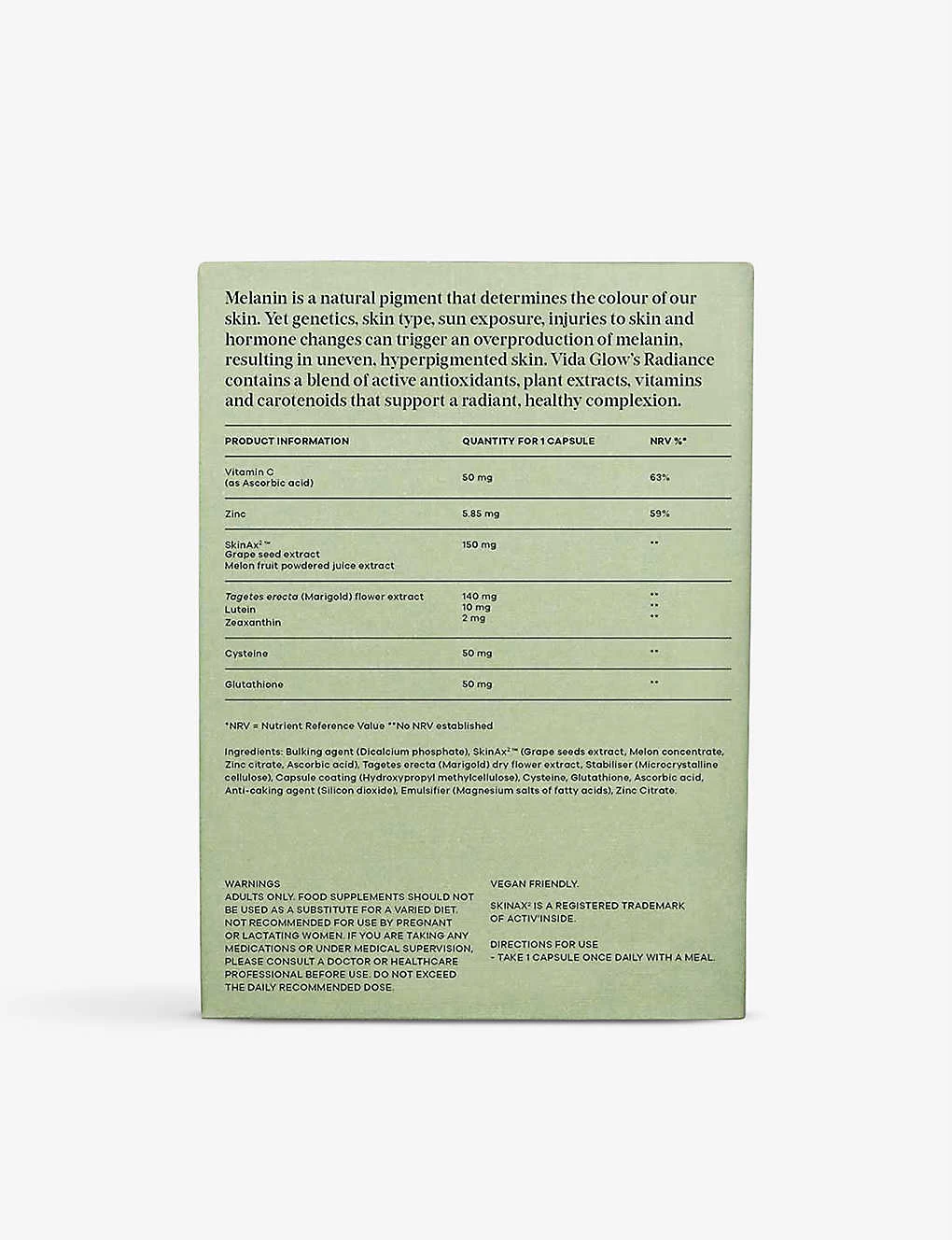 Bulking agent (Dicalcium phosphate), SkinAx2â„¢ (grape seed extracts, melon concentrate. zinc citrate ascorbic acid), Tagetes erecta (Marigold) dry flower extract, Stabiliser (microcrystalline cellulose), Capsule coating (hydroxylpropyl methylcellulose, Cysteine, Glutathione, Ascorbic Acid, Anti – caking agent (Silicon dioxide), Emulsifier (Magnesium salts of fatty acids), Zinc citrate,