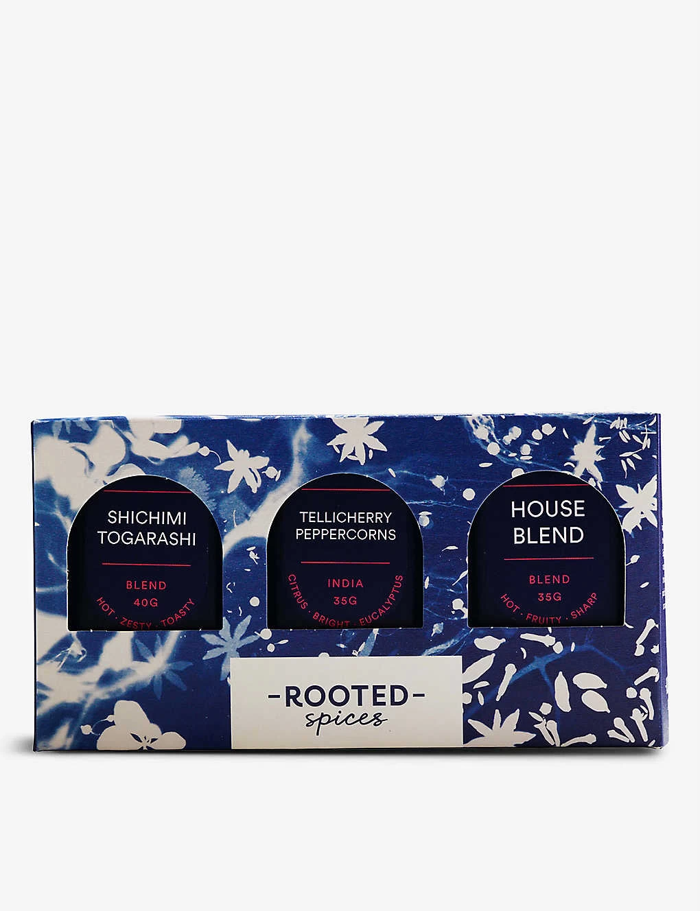 Shichimi Togarashi: red chilli pepper, mandarin peel, sesame, sea lettuce, hemp seed, poppy seed, Sansho pepper(Sesame), House Blend: Aleppo pepper pul biber, Urfa pepper pul biber, cured sumac (ground sumac cured with lemon salt), sunflower oil, Tellicherry Black Peppercorns