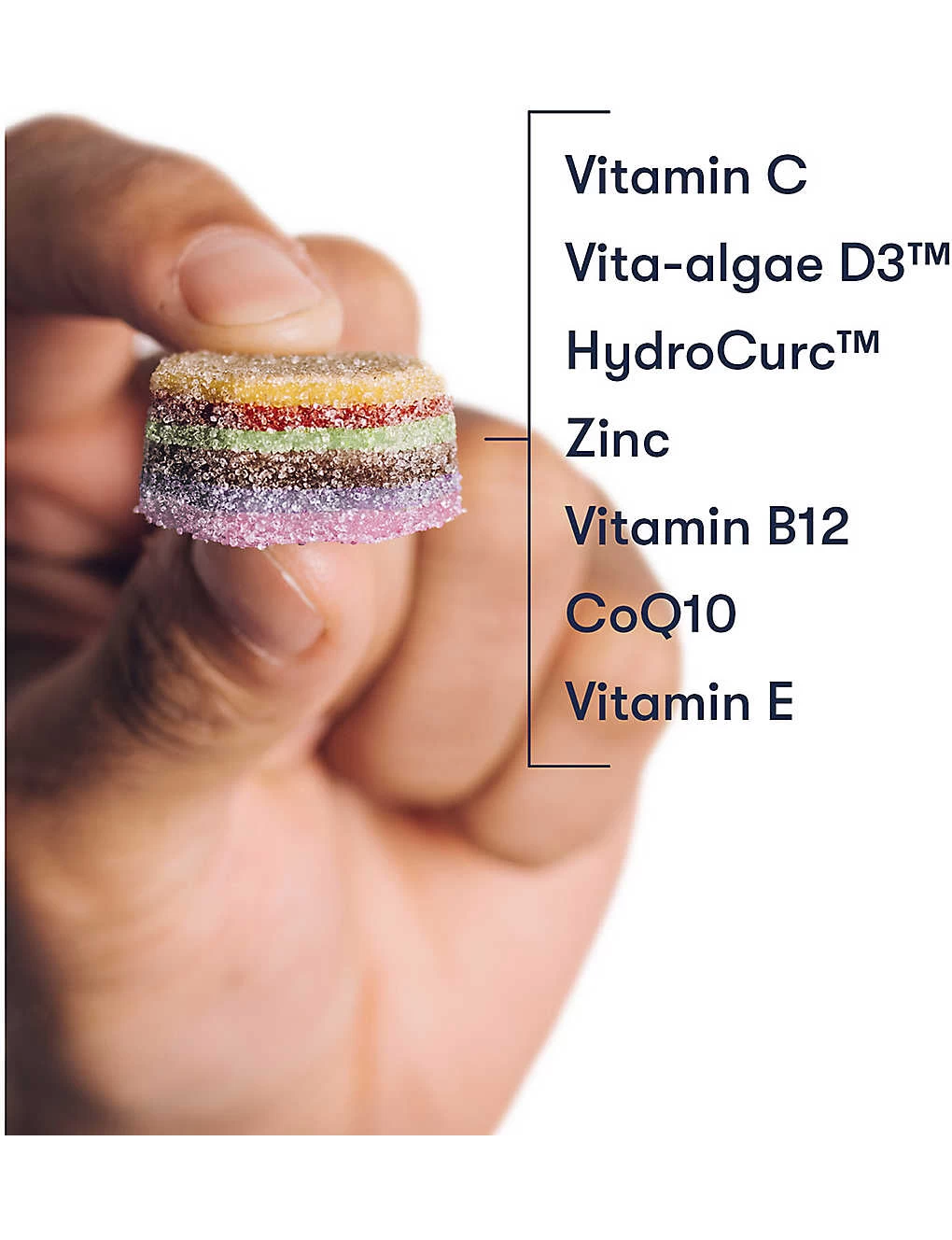 Ingredients: Maltitol Syrup, Erythritol, Pectin, Potassium Citrate, Citric Acid, Maltodextrin, Malic Acid, Vita-algae D3, Ashwagandha, Lycopene, Ginger Extract, HydroCurc, Vitamin B12, LactoSpore, Black Pepper Extract, Natural Colours & Natural Flavours from Plants & Fruits. , Nourishment , Amount , NRV , Vita-algae D3â„¢ , 300IU , 150% , Vitamin C , 96mg , 120% , HydroCurcâ„¢ & Black Pepper Extract , 95mg + 1mg , N/A , CoQ10 , 30mg , 100% , Zinc , 10mg , 100% , Vitamin E , 24mg , 200% , Vitamin B12 , 3.75mcg , 150% , Food supplements must not be used to substitute a healthy diet. If you are pregnant, breastfeeding or taking other medication or medical supervision, please contact your doctor or a healthcare professional before use. , Keep out of reach of children. , Made in Birmingham, UK by Remedy Health Ltd.
