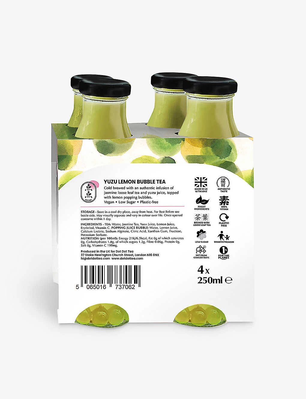 Lemon Juice, TEA: Water, Jasmine Tea, Yuzu Juice, Erythritol, Vitamin C, POPPING JUICE BUBBLE – Water, Lemon Juice, Calcium Lactate, Sodium Alginate, Citric Acid, Xanthan Gum, Fructose, Potassium Sorbate,